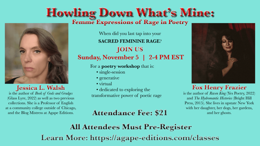 This single-session, two-hour, generative workshop will be co-taught by Jessica Walsh and Fox Henry Frazier. At our class meeting, we will discuss concepts of rage and outrage, and the potential powers of anger—particularly of female or femme expression—in poetry. Our guided discussion will draw on craft writing, essays, and lectures. During the latter portion of the class, we will sequentially offer several prompts drawn from favorite poetic works to help you generate your own writing that embraces all the rage! Pre-registration is required, as (small) reading packets will be sent out to participants in advance of the class meeting.