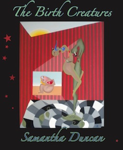 “How a woman’s body turns alien, fantastical, so foreign to herself when she grows a child—’under the crust I am cherry pie.’ Samantha Duncan’s powerful chapbook-length poem The Birth Creatures traces a 37-weeks-pregnant woman’s struggle to accept what this birth will mean: ‘I’m an afterthought to be studied/ my insides sighing/ against the hunger for/ more of me it you.’ Besides the innumerable bodily changes (what Duncan calls a ‘revolution’), in the house where the woman waits for labor, a cypress tree roots under the crib, a rhinoceros appears where the bouncer was to go, bird bones appear in the bathroom. The Birth Creatures is in one way true to the tradition of magical realism, but also unapologetically peeks at the undersides (those secret, sad feelings) of what it means to become a mother: ‘a journey a century/ transforms insides/ into leftovers/ the waste the time// the assimilation of you/ into me.’ Yet also, the joy: ‘we are doing/ we are real.’”